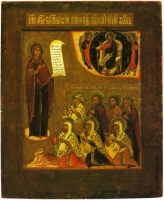10. Семь отроков Эфесских. К. XVI – н. XVII в. ГРМ. Инв. ДРЖ 1055. 35,2х29,4 см. Находилась в коллекции С. Г. Строганова. В 1879 г. передана им в музей С.-Петербургской Духовной Академии. В ГРМ пост. до 1934 г. из Музея художественно-археологического отделения факультета общественных наук Петроградского университета. Реставрирована до поступления в музей. Реставрационное исследование и частичное раскрытие произведены в ГРМ в 1981–1982 гг. А. Т. Дедненковым, в 1983 г. — Р. А. Кесаревым.
