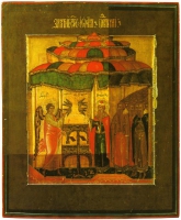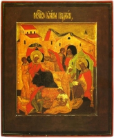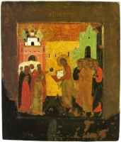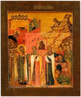 9. Рождество Николы, с житием. 1601 г. ГТГ. Инв. 14216. 36х30 см. На обороте две надписи: "1601 сия икона домовая соборного храма Благовещения святеи богородицы Соли Вычегодские на посаде поставление Никиты Григорьевича сына Строганова” и "Письмо Семена Бороздина” (Антонова, Мнева 1963. Т. 2).