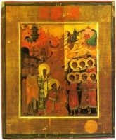 Огненное восхождение пророка Илии на небо. К. XVI – н. XVII в. ПХГ. Инв. И 56. 30х30,5 см. Из церкви Похвалы Богоматери с. Орел Усольского района в 1941 г. Раскрыта В. В. Филатовым в 1947 г. в ГЦХРМ.