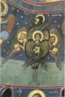 Другие образы ангелов, неантропоморфные. Перед вами серафим из церкви Спаса Преображения на Ильине улице, в Новгороде. Феофан Грек расписал эту церковь в 1378 году. Слово «серафим» встречается в Библии в книге пророка Исайи: «Вокруг Него стояли Серафимы; у каждого из них по шести крыл: двумя закрывал каждый лице свое, и двумя закрывал ноги свои, и двумя летал. И взывали они друг ко другу и говорили: Свят, Свят, Свят Господь Саваоф! вся земля полна славы Его!». «Серафим» в переводе с древнееврейского означает «пламенеющий, огненный», поэтому в Ерминиях (руководствах для иконописцев) изображать серафимов предписывалось красными. Дионисий Ареопагит писал о них: «…имена сии выражают Богоподобные их свойства. Ибо, что касается до наименования Серафимов, то оное ясно показывает непрестанное и всегдашнее их стремление к Божественному, их горячность и быстроту, их пылкую, постоянную, неослабную и неуклонную стремительность, – также их способность действительно возводить низших в горние, возбуждать и воспламенять их к подобному жару; равно как означает способность, опаляя и сожигая, таким образом очищать их, – всегда открытую, неугасимую, постоянно одинаковую, светообразную и просвещающую силу их, прогоняющую и уничтожающую всякое омрачение».
